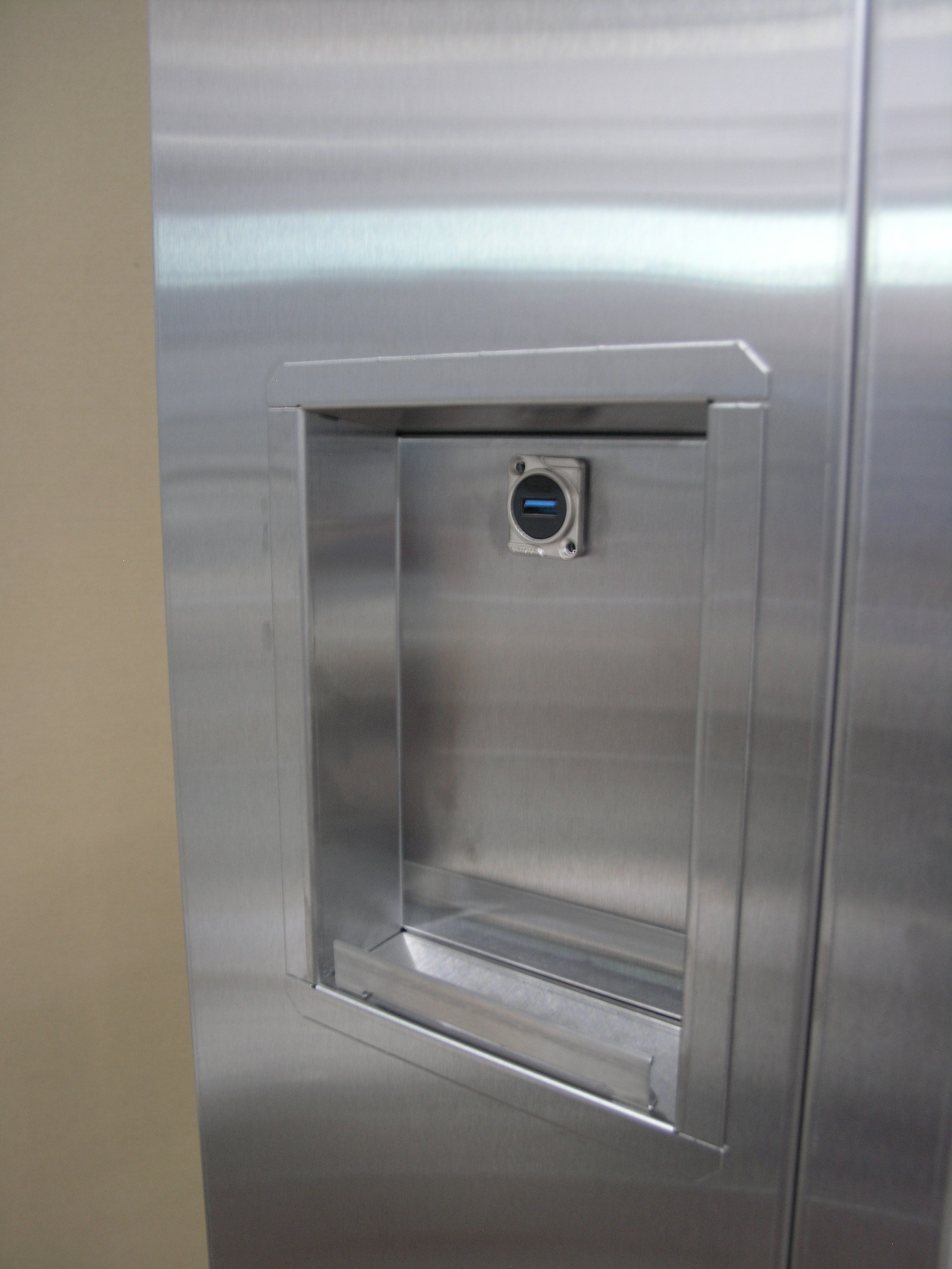 Интегрированные ниши с 3-х сторон корпуса оборудованы гнездами (USB) для зарядки мобильных устройств. (Параметры питания зависят от установленного оборудования). Конфигурация ниши обеспечивает защиту гнезд от прямого попадания осадков и размещения питаемого оборудования.